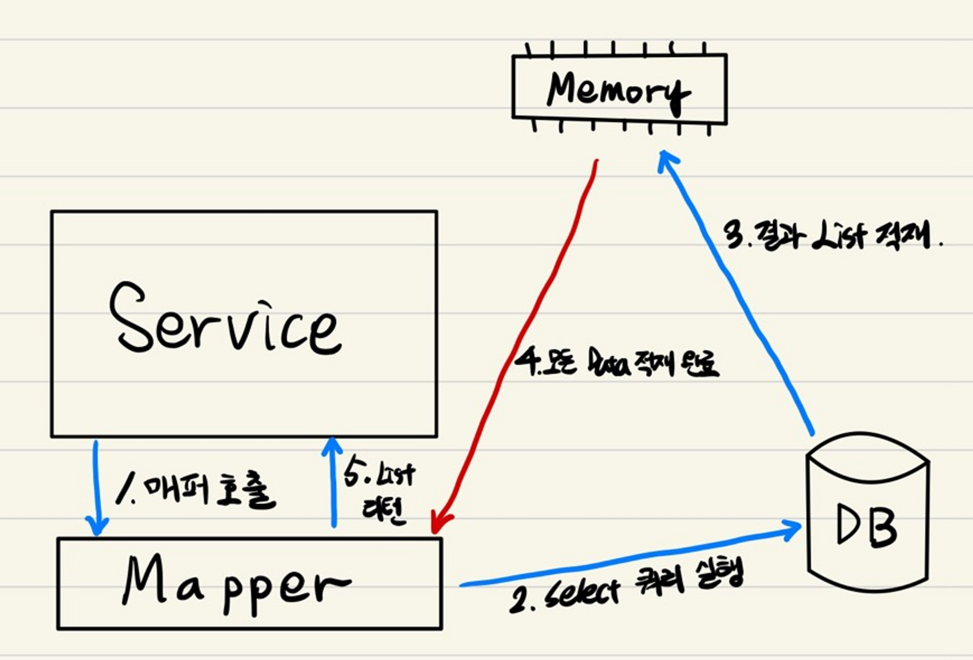 DB에서 대용량 데이터를 불러와 사용한다면 위 그림처럼 모든 데이터가 메모리에 적재된 뒤에야 해당 데이터를 소비할 수 있다. 이 경우, 데이터가 너무 많다면 outOfMemoryError가 발생할 수도 있고, 그렇지 않다고 하더라도 메모리를 너무 많이 점유해서 문제가 될 수 있다.
