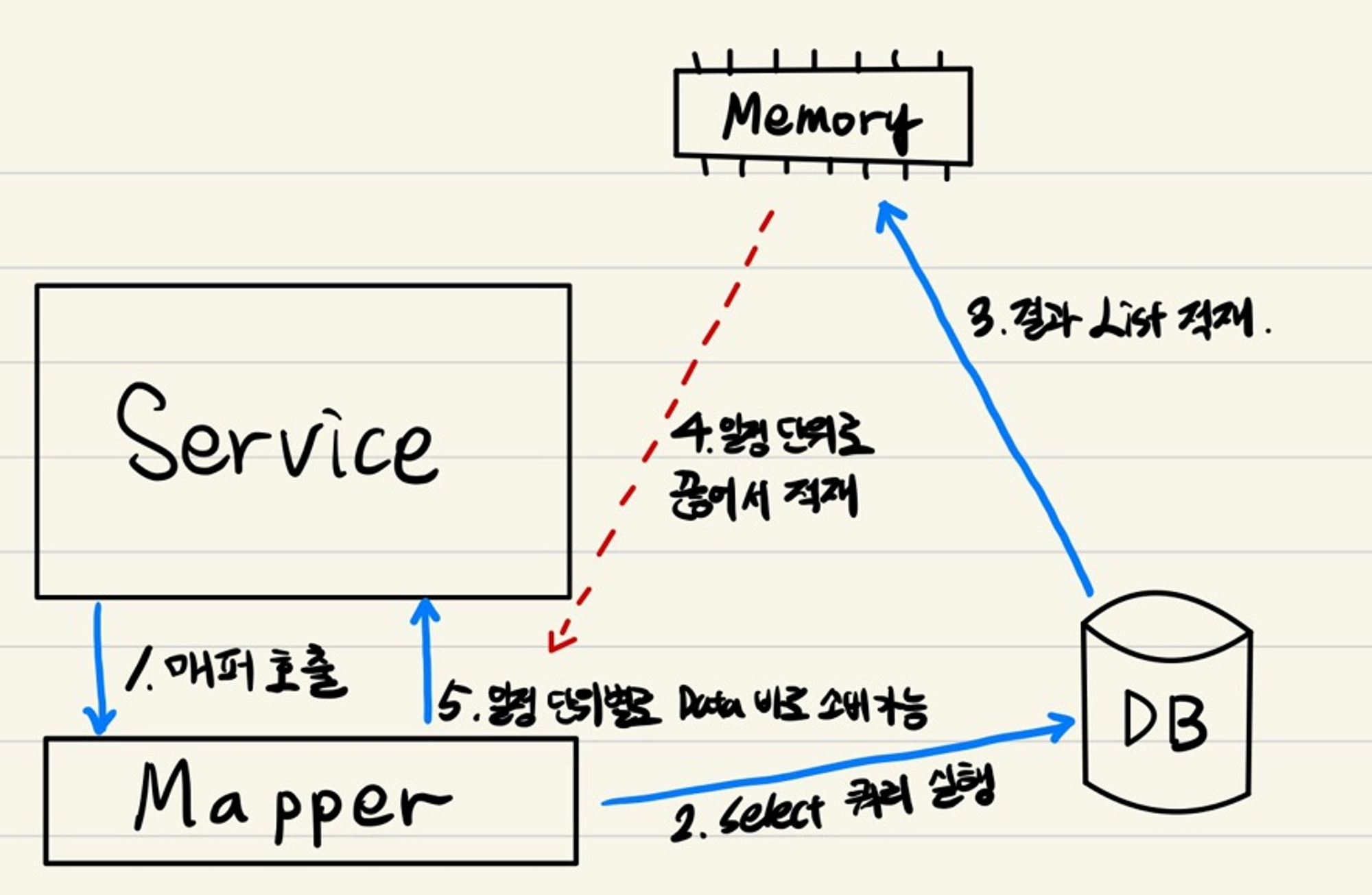 DB에서 대용량 데이터를 불러와 사용한다면 위 그림처럼 모든 데이터가 메모리에 적재된 뒤에야 해당 데이터를 소비할 수 있다. 이 경우, 데이터가 너무 많다면 outOfMemoryError가 발생할 수도 있고, 그렇지 않다고 하더라도 메모리를 너무 많이 점유해서 문제가 될 수 있다.